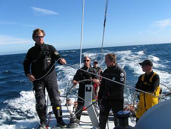This is NZL_Undercover (wearing yellow pants and a cap, with arms folded) + crew on a 50 footer doing the Kapiti-Chetwodes earlier this year. Its early Saturday morning after starting in Wellington on the Friday evening, heading towards Cape Jackson - boatspeed 15-17 knots.