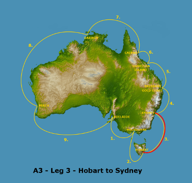 The 630 NM Sydney to Hobart Yacht Race is considered one of the world's top three classic races along with the Fastnet and the Newport to Bermuda races. We will be doing the reverse trip as Leg 3 of the A3 - AGage's Around Australia Series. The course starts at the normal finish line opposite Battery Point in the Derwent River at Hobart and finishes at the normal start line in Sydney Harbour between Shark Island and Bradley's Head. The majority of the course may be a straight rhumb line but don't be deceived. The Sydney Hobart Race has reached legendary status because it is very difficult and is a killer, literally. In the 1998 race five yachts sank and six crew lost their lives. The east coast of Tasmania, Bass Strait and the east coast of mainland Australia all present different weather patterns. Beware of the monster low pressure system that develops quickly in the Tasman Sea between Australia and New Zealand. Doing the classic race in reverse should be easier with either a reaching nor-wester or southwest and southeast winds for a spinnaker run to Sydney.