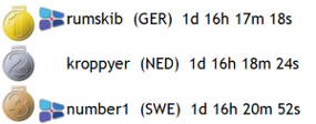 As for the top 3, I've been a bit behind number1 and in front of rumskip up to Caribou Island, then things got scrambled a bit. rumskip, fast as he is, began to gain places. I got stuck in a fishing net (I did something stupid with my course and went 100 degrees the wrong way for some seconds), and dropped to 7th place. I while later, number1 accidentally tacked too soon, and lost hist first place to rumskip, who didn't let go of that first place for the rest of the race. number1, trying to get his lead back, took a risk in the next leg (to Passage Island light) but it didn't pay of. I had about the same strategy as rumskip, which brought me back to second place after Passage Island light. Little changed as we approached the finish.
