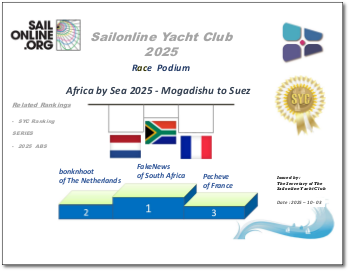 But a great move by FakeNews, Pecheve and a few other far-sighted SOLers saw the leaders come quite unstuck. Tacking for the war-mongered shore of Sudan, whilst the rest just listened to the forecast on the router (radio), proved to be a winner for Fakenews, his first ever on SOL, with Pecheve third, just astern of bonknhoot, but well ahead of early leader CriticalHippo. SuperSOLING FakeNews!