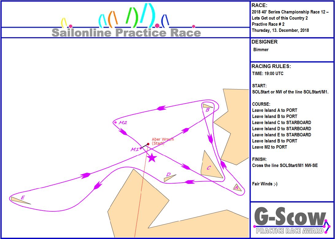 The SECOND pre-race practice race ahead of the 2018 40' Series Championship Race 12 – Lets Get out of this Country 2, will be held today, Thursday, 13. December 2018, as follows: TIME: 19:00 UTC START: SOLStart or NW of the line SOLStart/M1 COURSE: Leave Island A to PORT Leave Island B to PORT Leave Island C to STARBOARD Leave Island D to STARBOARD Leace Island E to STARBOARD Leave Island B to PORT Leave M2 to PORT FINISH: Cross the line SOLStart/M1 NW-SE DIAGRAM (Race Map): click here RACING: Bimmer (DEN) brellis (USA) RainbowChaser (GBR) robert1 (SWE) FINAL RANKING: 1. robert1 (SWE) 2. Bimmer (DEN) 3. brellis (USA) 4. RainbowChaser (GBR) --- Last Edited by Bimmer at 2018-12-13 19:02:15 --- --- Last Edited by Bimmer at 2018-12-13 20:32:56 --- |
