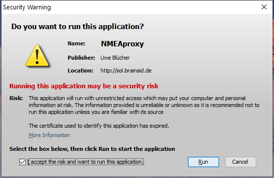 (If you do need java for something else then do not uninstall it. No conflict with suggested download) I downloaded OpenWebStart windows-x64 1 6 0.exe from openwebstart.com/download/ and installed it. With me now brainaids nmea's are working. OpenWebStart windows comes with sort of own build-in java. Have some patience and wait till openwebstart downloads app from brainaid's. (part of the waitingtime is with every start openwebstart checks for updates.) --- Last Edited by appelkrat at 2022-11-17 11:52:20 --- Compete with yourself; share with all |