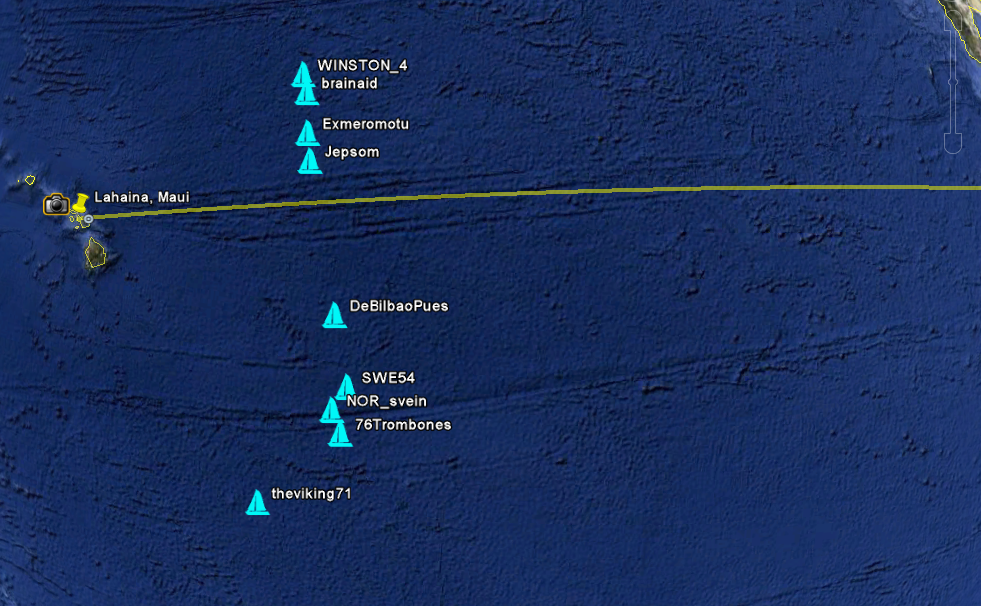 Wake up saw the Southern boats spread out some, in my case from a slight shift as I slept. Another dozen boats have joined close behind from the North Group. 76T, (on DCs ?), is farthest south at 18.1n 152.5w. Lakis (p.16 overall,) is the northern outlier of Group South at 19.2n 152.4w. Others are between those or a little behind. Disregarding 'Rankings' Malicovvv seems to lead the Group. The northern group is splitting tacks, and fighting less wind from a difficult direction. |